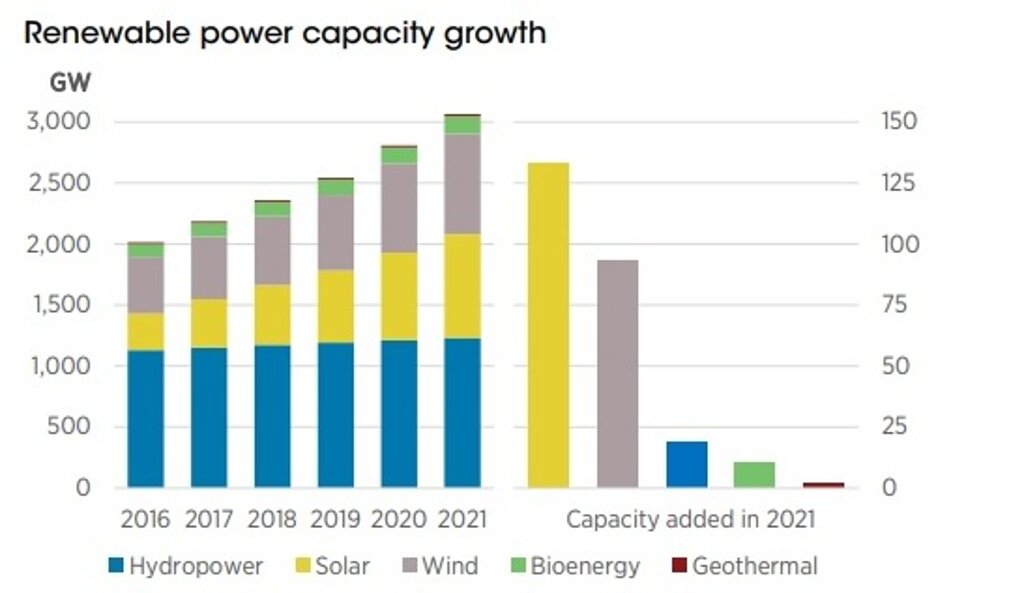 Più nel dettaglio, il report mostra che il solare e l’eolico hanno continuato a dominare la nuova capacità di generazione. Insieme, entrambe le tecnologie hanno contribuito per l’88% alla quota di tutta la nuova capacità rinnovabile nel 2021. La capacità solare si è posizionata in testa con il 19% di aumento, seguita dall’energia eolica, che ha accresciuto la sua capacità di generazione del 13%; come risultato, per la prima volta, la capacità solare globale totale ha ora superato la capacità installata di energia eolica.